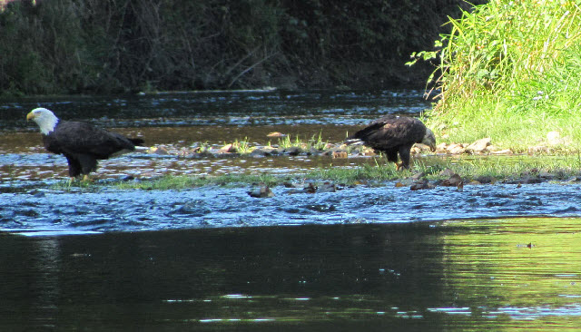 Paddled the canoe this morning from Bothell upriver 5.2 miles so 10.4 roundtrip. Cold. I could see my breath when I started. Lots and lots of salmon now. In fact, on the way back I had to stop to let these bothersome birds finish lunch (note fins in water – right foreground).