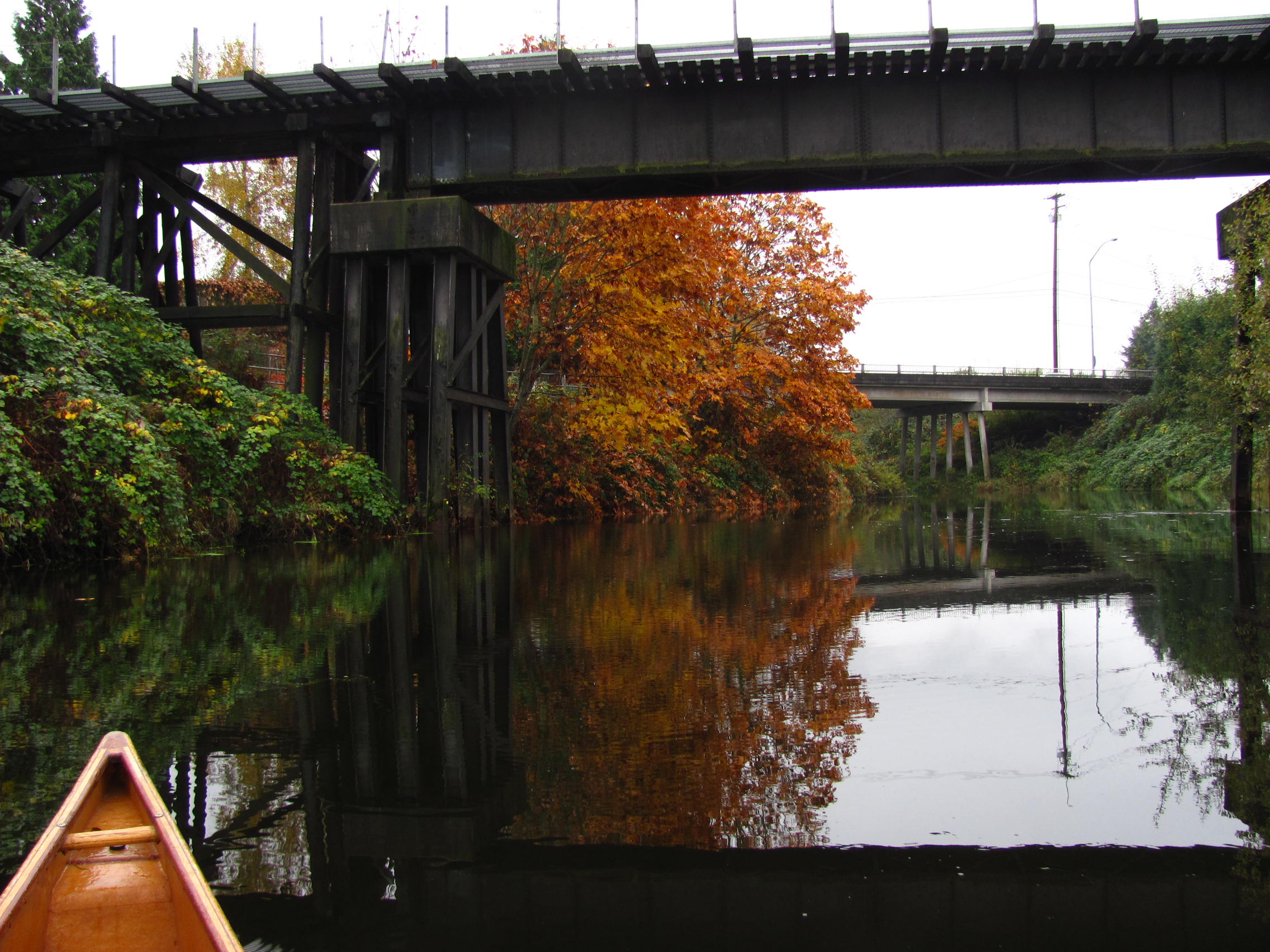 Cool rainy dark day – but remember, in less than 6 weeks, every day will be longer than the day before (FYI – Seattle on Dec 21: Sunrise 7:55am Sunset 4:20pm) . Paddled the canoe up from Bothell (6 miles RT). Water level up from the record rain: bald eagle, herons but the salmon run is almost over.
