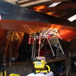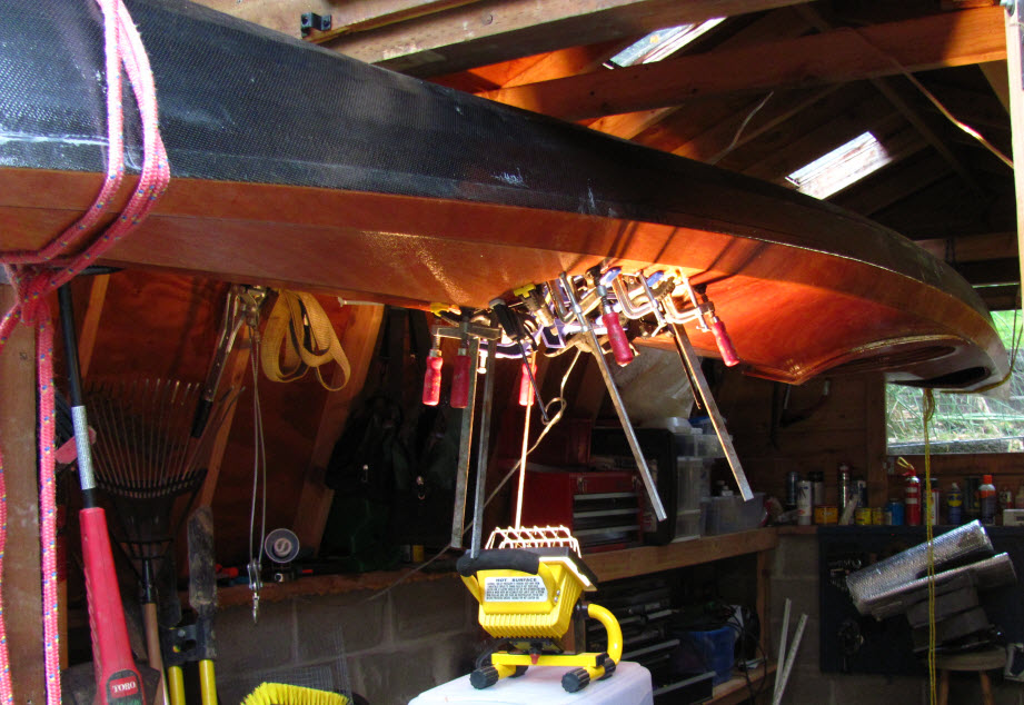Lacking an elegant workspace I am using a shop lamp as a local heater on the epoxy on the front hatch lip. The aft hatch lip is done and the bulkheads are in place, but not finished. Those should get done today. I have a new deadline – Tuesday night.