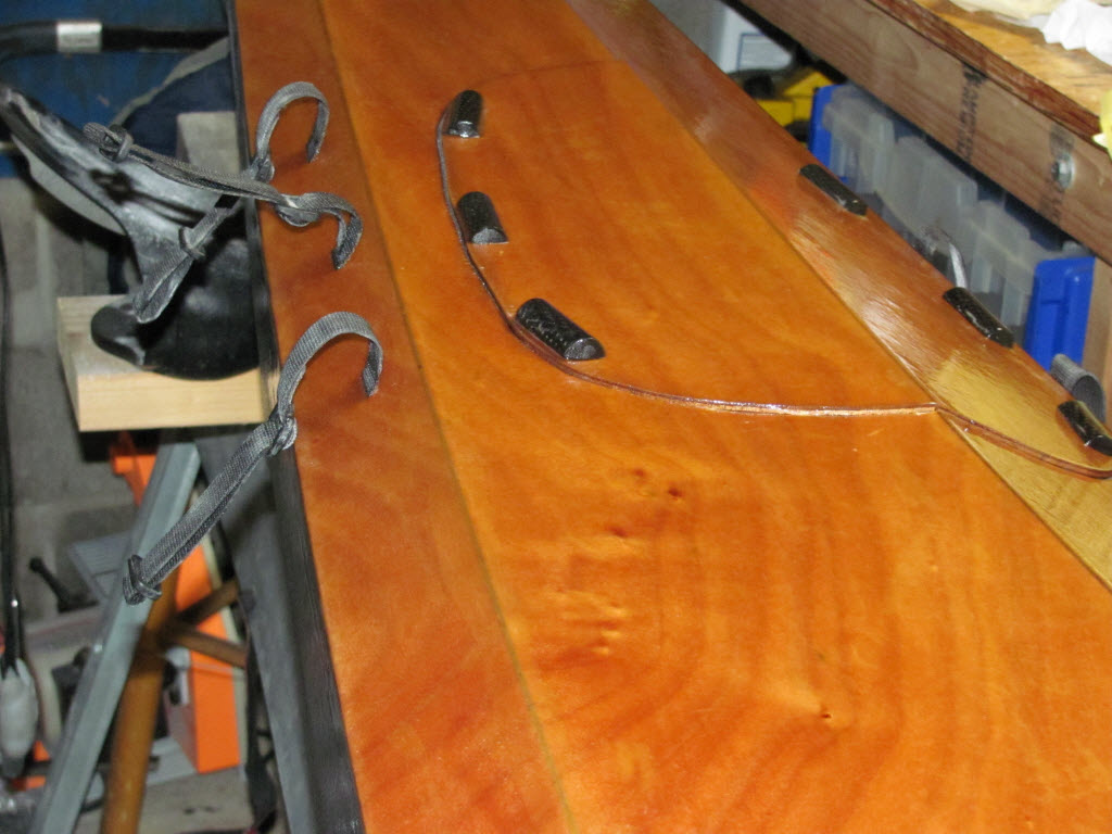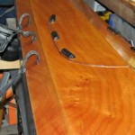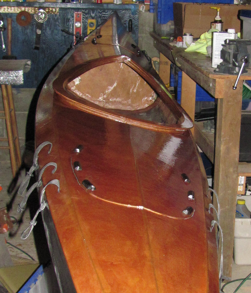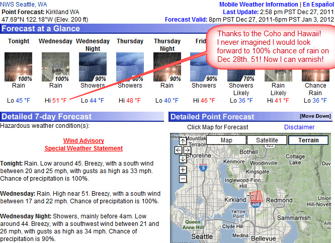 Stormy weather, lots of rain, wind, and 50+ degrees. That temp is what was needed for varnishing. It came out better than I expected (so far).