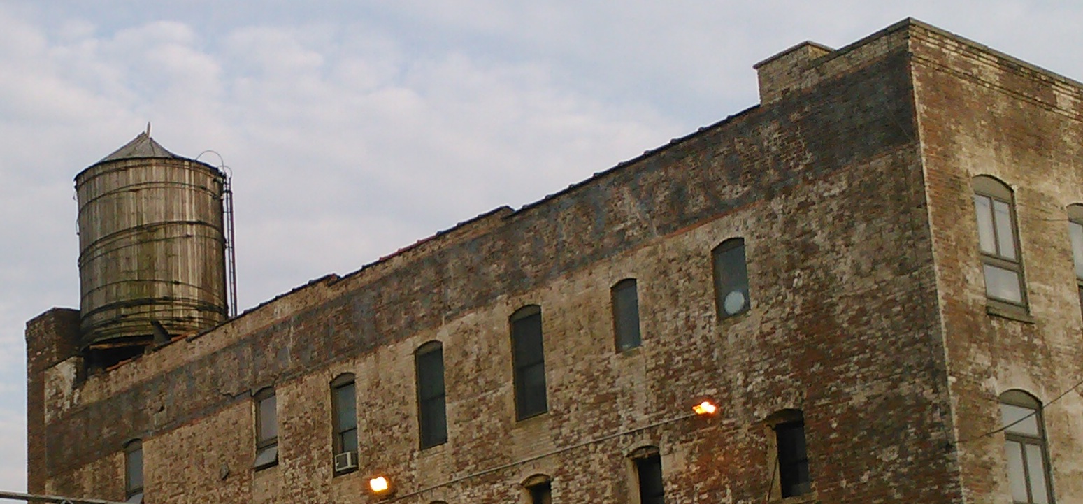 Note to self: bring your camera! From my phonecam, here is a wood stave cistern on an old industrial building in Queens. Though I can’t make out the company name, the church across the street was completed in 1869 so I am guessing the same time frame. This neighborhood is in transition (probably always has been) but it would be nice if they could preserve some of the brick facade architecture.