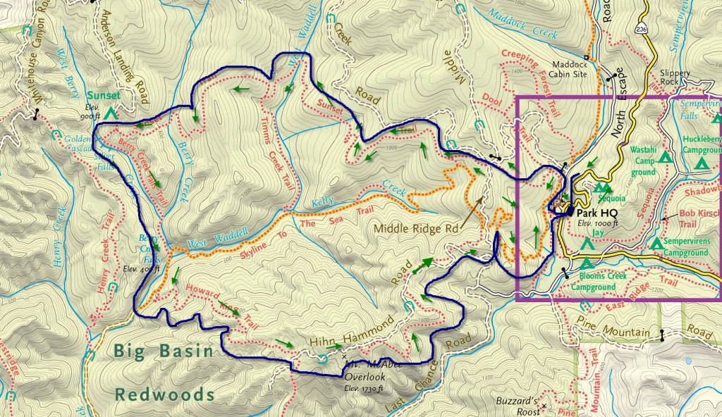 Since I had to miss a great night of racing last night (66 degrees and a 20mph S wind), I stayed here and went hiking among the Redwoods today. Totally overdid it – I will not provide the dramatic details because it would reflect so poorly on my judgement – except to say it was 6 hours of hiking which means probably around 15 miles.
