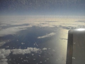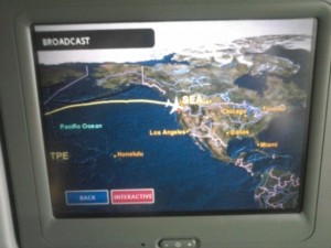 Somewhere near the International Date Line and then a sunset descent over Puget Sound. Inasmuch as commercial flights can be great, this one was.