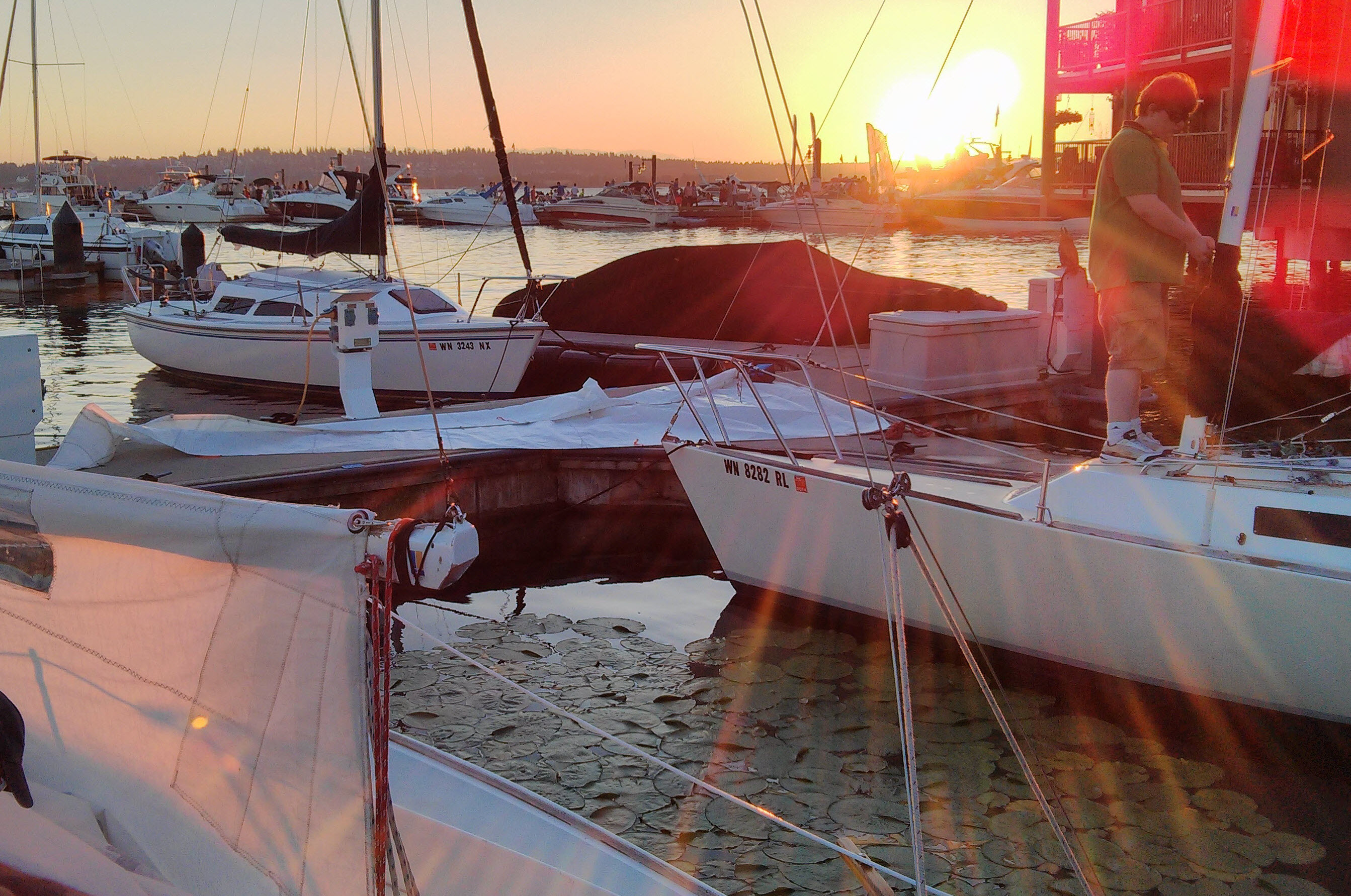It was a warm night. Big community event at the park with live music and wine-tasting. NW wind at 10. Yet we only had 4 people make it. Me and DT on GJ for a short twice around race on the Kirkland Coast. Nice start meant we were able to hold off all the big fast boats that started 5 minutes later (except the 70 footer) and so we finished somewhere at the top (no official scoring this year). Low drama and not much learned, just a nice night on the lake doing something fun for no additional cost which made me feel privileged because so many expensive boats out on the lake tonight are only used 10 days a year and this is my 20th sailing post in 2013 – a total of 41 races so far smashing my previous record – it almost makes up for those many hours working on the boats in the off-season to make them faster.