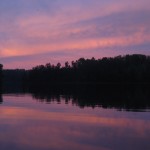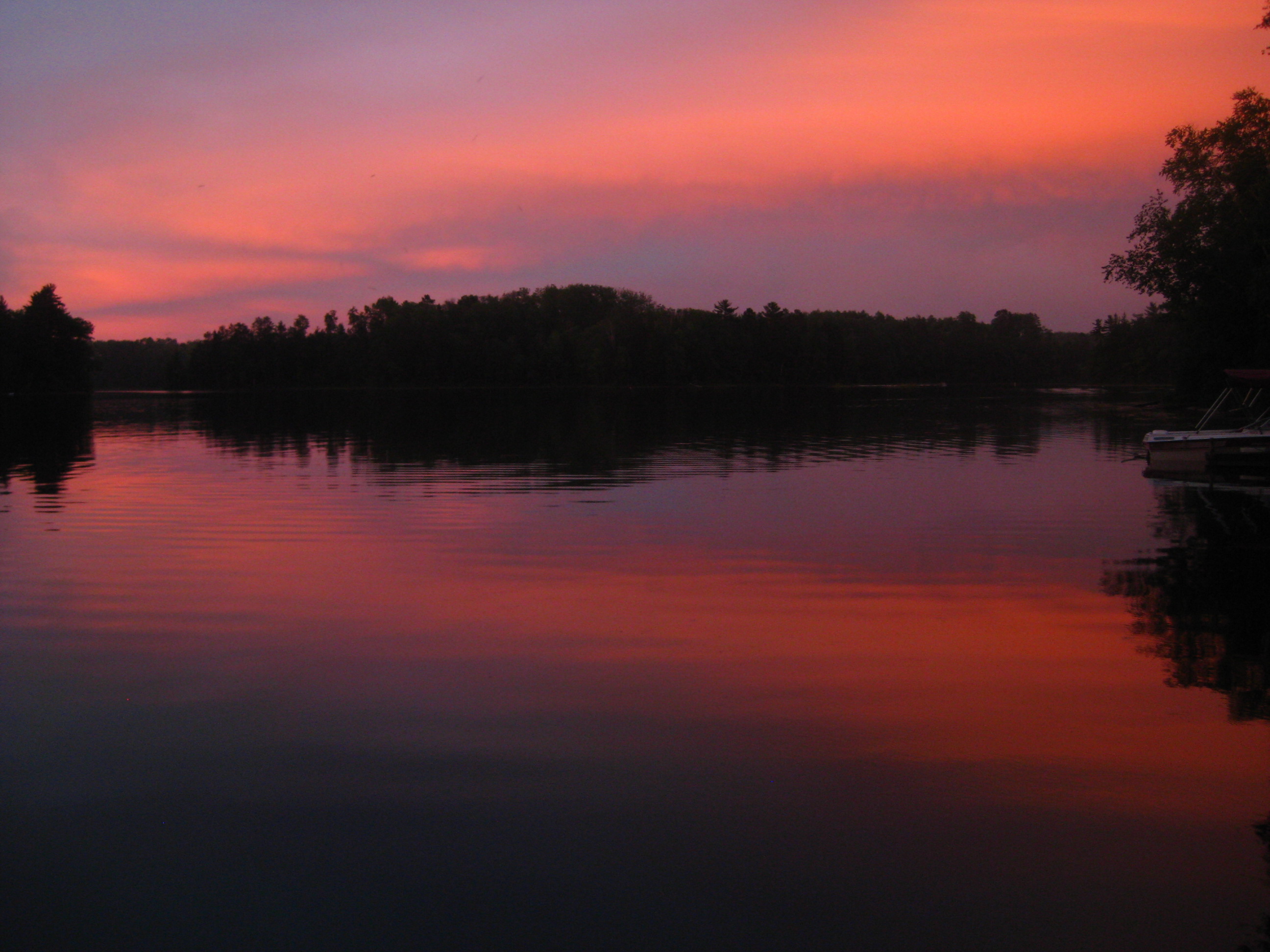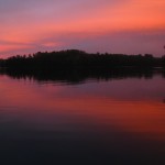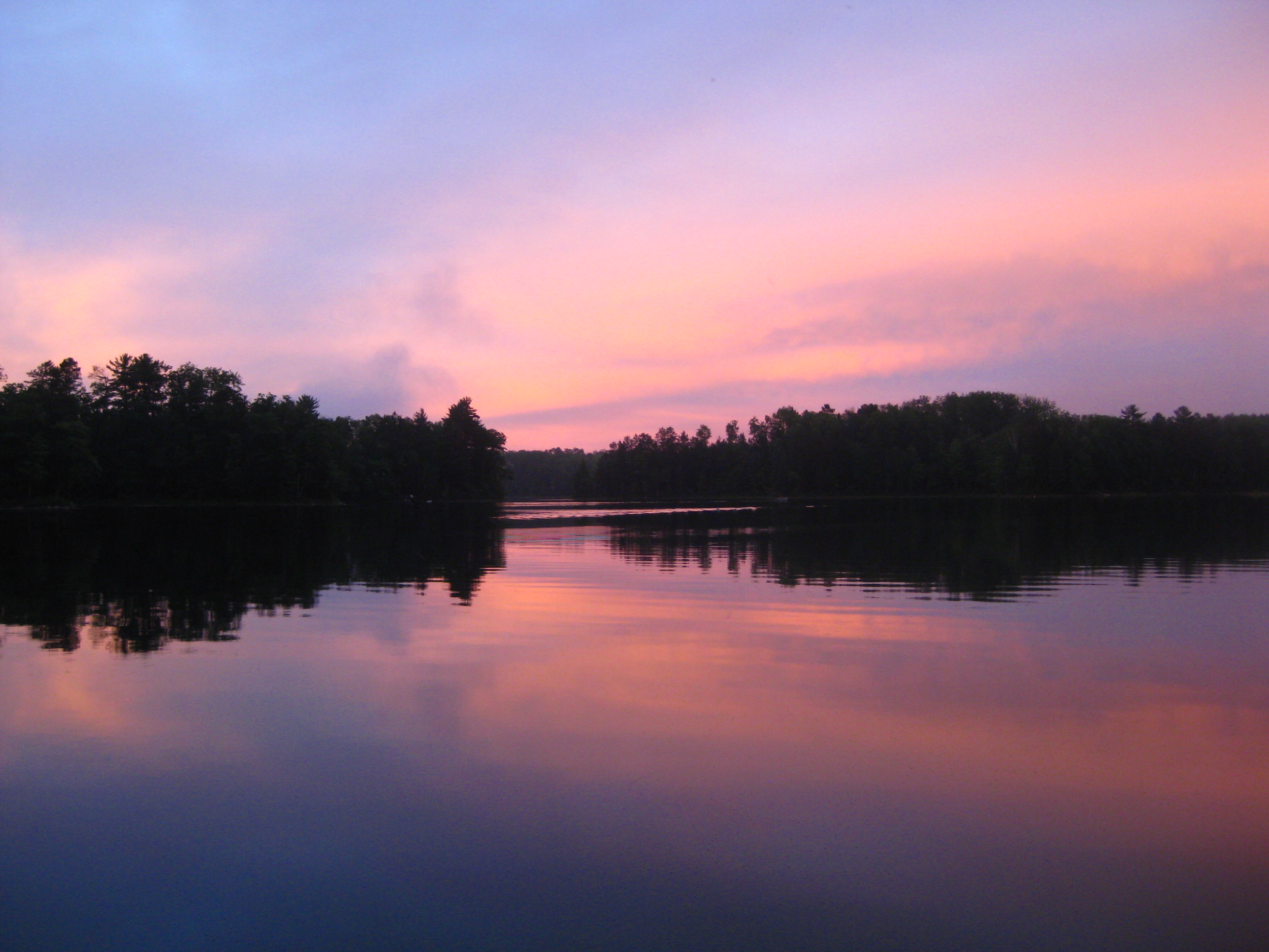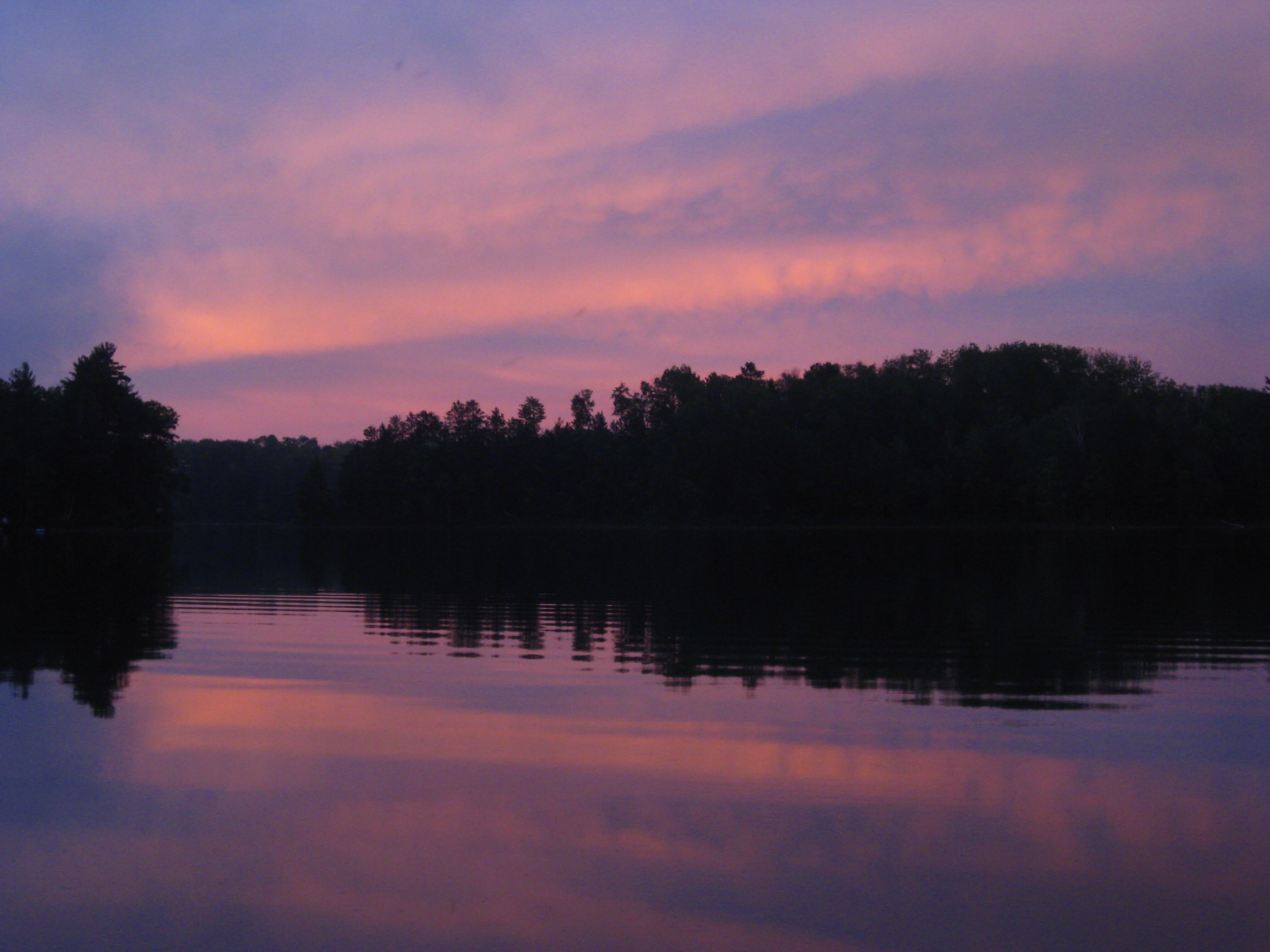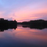 An evening paddle around Big Crooked. It stopped raining for a while and we had a beautiful sunset. I took some photos of loons but they do not meet the high standards of my family (competitors). I took some better pictures later in the week anyway. Here is the lake and the sunset.
