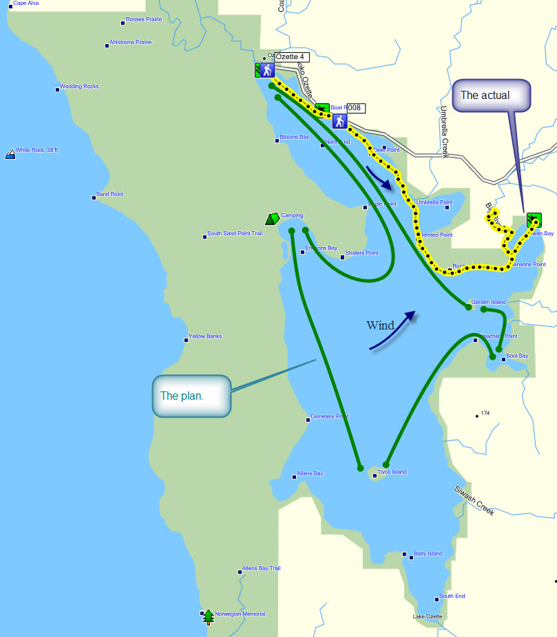The morning started clear with a mild wind. Thanks to a bad night’s sleep (long story) I got a late start for my kayak adventure on the Lake. The trip I had mapped out was 17 miles and included stops at 2 islands, a river entrance and a boat-in only campsite. I packed the kayak for the 1st time – I have only used it for training and racing, never touring. Water, food, clothes, emergency stuff, etc.